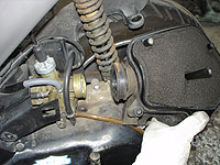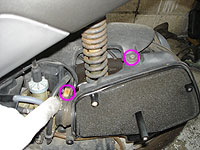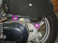 ある程度、キャブが露出するのが分かる。ドレンボルトなどは、クリーナーカバーを外した方が、回しやすいだろう。 | 次に、ダクトのゴムバンドのねじを緩め、さらに、ボックス上部のリアフェンダー取り付けボルトを外す。 【ボルト】 |