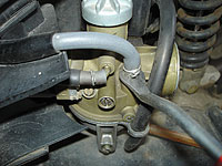 ある程度取れかかったら、手で取る。鉄則だ。 | ここで、ガソリンホースを抜く。絶対プライヤーなどで取るな!クリップ外しや専用工具を使って、ホースにキズを付けないように取ろう。 | ||
