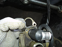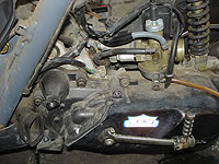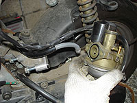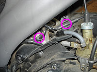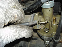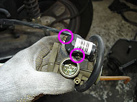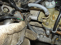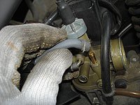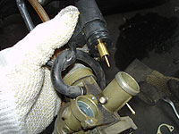 スロットルバルブを外す。上部を回せば外れるのだが、アイドル調整のキリコミが手前に来てるのを覚えておこう。逆に付けると、エンジン掛かりませんよー | オイルホースを外す。 | ||