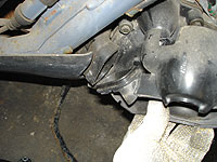 | 後方への力で外す。上や下にこじったりすると、ゴムのダクトがひび割れを起こしたりするので注意! | この状態でフィルターボックスは外れるのだが、キャブにガッチリはまってると思うので、ドライヤーなどで暖めて、マイナスでこじろう。 |