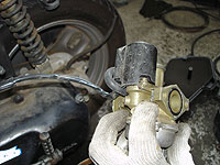 | 本体側にもシューとしておこう。 | キャブクリーナーを使い、導通を確認しながら、フロートチャンバー部にたっぷり溜める。 | このちっちゃい▲が、フロートバルブ。段つき磨耗などをしていたら、即交換だ。消耗品なので、分解ついで交換しちゃいましょう。 | ||