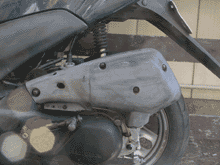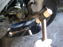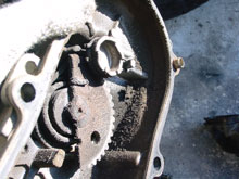 | ケース裏には、ゴムかすがたっぷり付いている。 | 上下左右に揺さぶりながら、取ろう。 | クランクケースは、固着しているので、プラハンマーで叩いて、取る。 | ||
