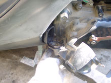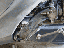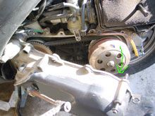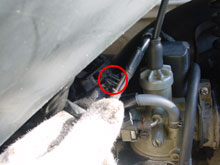 | さらに、緑の点滅のカバーも外す。非常に面倒だ。 | くだらない化粧のカバーが付いているので、非常に不愉快になるが、頑張って外そう。 | 次に、チョイ前方の赤丸のボルトを緩め、取る。 【ボルト】 |