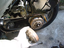 | ベルト、クラッチごと取れるはずだ。 | プーリーを引き出します。 | プーリーを取ると、裏にはカバーが付いている。 | ||