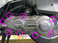 | まず、駆動系をバラす前に、やりやすいようにサイドカバーを外しておこう。 | クランクケース脇から見える、8本のボルトを外す。 【ボルト】 |