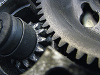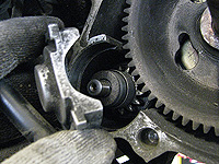 | 次に、クラッチ側。 | 一通り、掃除が終わったら、組み付けだ。プーリー側を先に組み込む。 | 中には、ピニオンギヤが付いている。これは、特殊工具が無いと外れないようになっている。外から掃除するだけにとどめておこう。 | ||