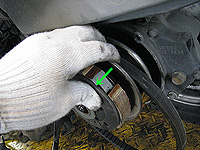 | 手で回してみて、異音が無いか確認する。ゴロ〜って言うようだと、中のベアリングがそろそろ寿命だ。 | ベルトを通す。 | この時、クラッチフェイスはギュっと握りながら、組み込む。 | ||