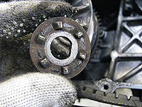 | ベルトをくっつけたまま、クラッチを外そう。 | クラッチアウターを外す。固い場合は、プラハンで軽く叩きながらだ。 | ドライブフェイスを外す。 | ||